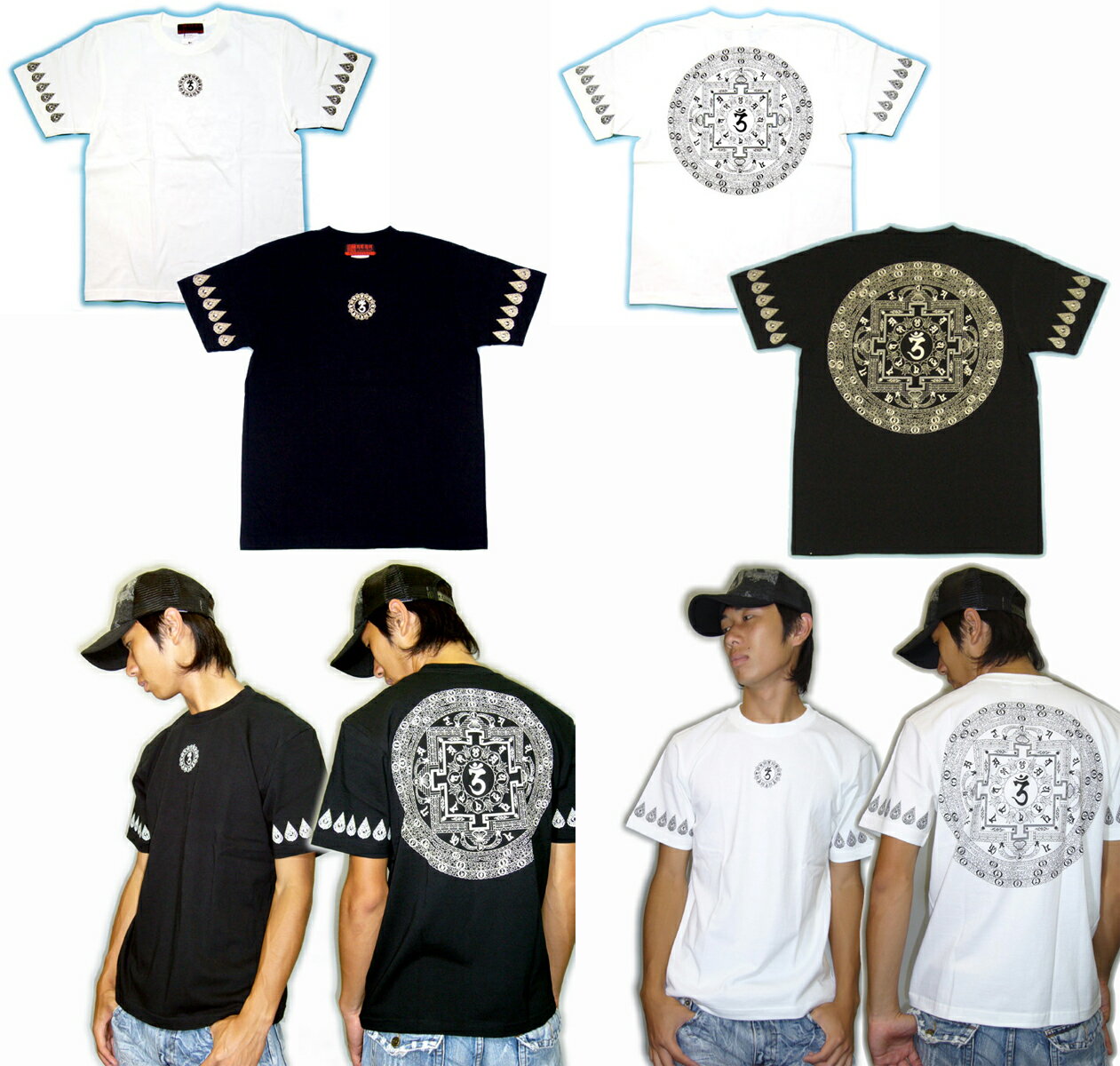 ブランド名「マハースカ」178cm65kgがMサイズ着用 「天星宮曼陀羅」梵字意味(てんせいぐうまんだら)胸は聖音「オーン」をプリント。